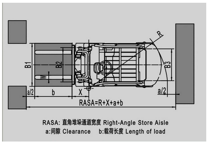 直角堆垛通道寬度是叉車進(jìn)入工作場地后能否有足夠空間作業(yè)的重要指標(biāo)。通俗點(diǎn)講就是叉車直行進(jìn)入兩個(gè)障礙物(比如兩排貨架)之間,然后旋轉(zhuǎn)90度后進(jìn)行叉取貨物時(shí),兩個(gè)障礙物之間的距離。理論上直角堆垛通道寬度越小越好,可以節(jié)省貨物的擺放空間,但實(shí)際上這個(gè)指標(biāo)跟很多參數(shù)有關(guān),計(jì)算值只做為參考。