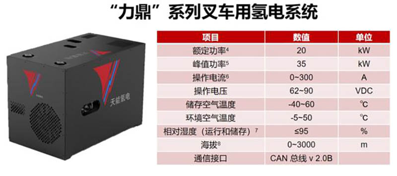 此次天能氫能源與徐工特機(jī)合作打造的適用于叉車專用的“力鼎”燃料電池系統(tǒng),額定輸出20kW,峰值輸出可達(dá)35kW,燃料電池電堆設(shè)計(jì)壽命可達(dá)10000h,兼容市面上大部分鉛酸或鋰電電動(dòng)叉車。產(chǎn)品在徐工叉車上進(jìn)行配置應(yīng)用后呈現(xiàn)“體積小,零碳排,加氫3分鐘、工作5小時(shí)”的特點(diǎn),有效解決了新能源叉車產(chǎn)品的續(xù)航問題。